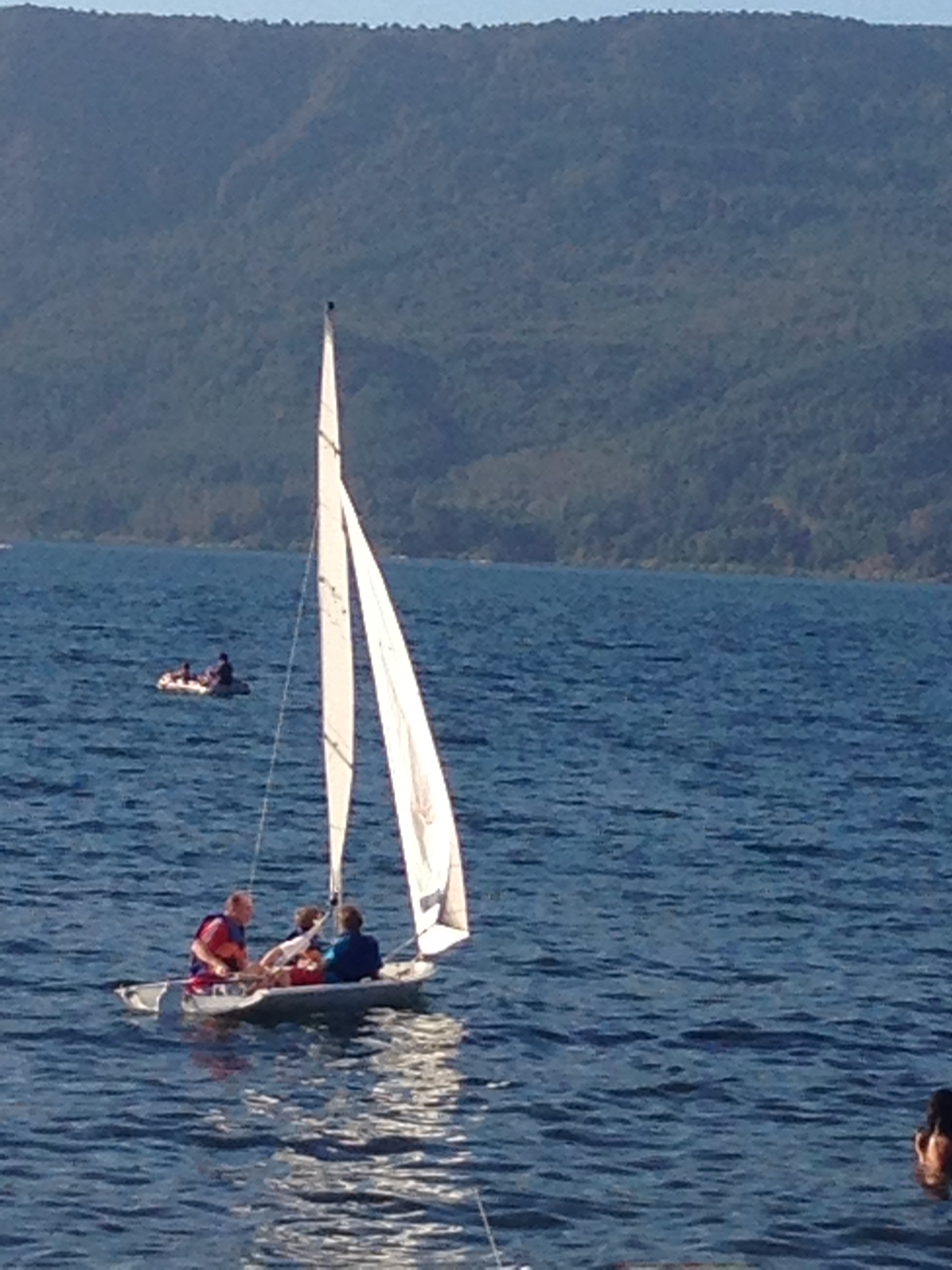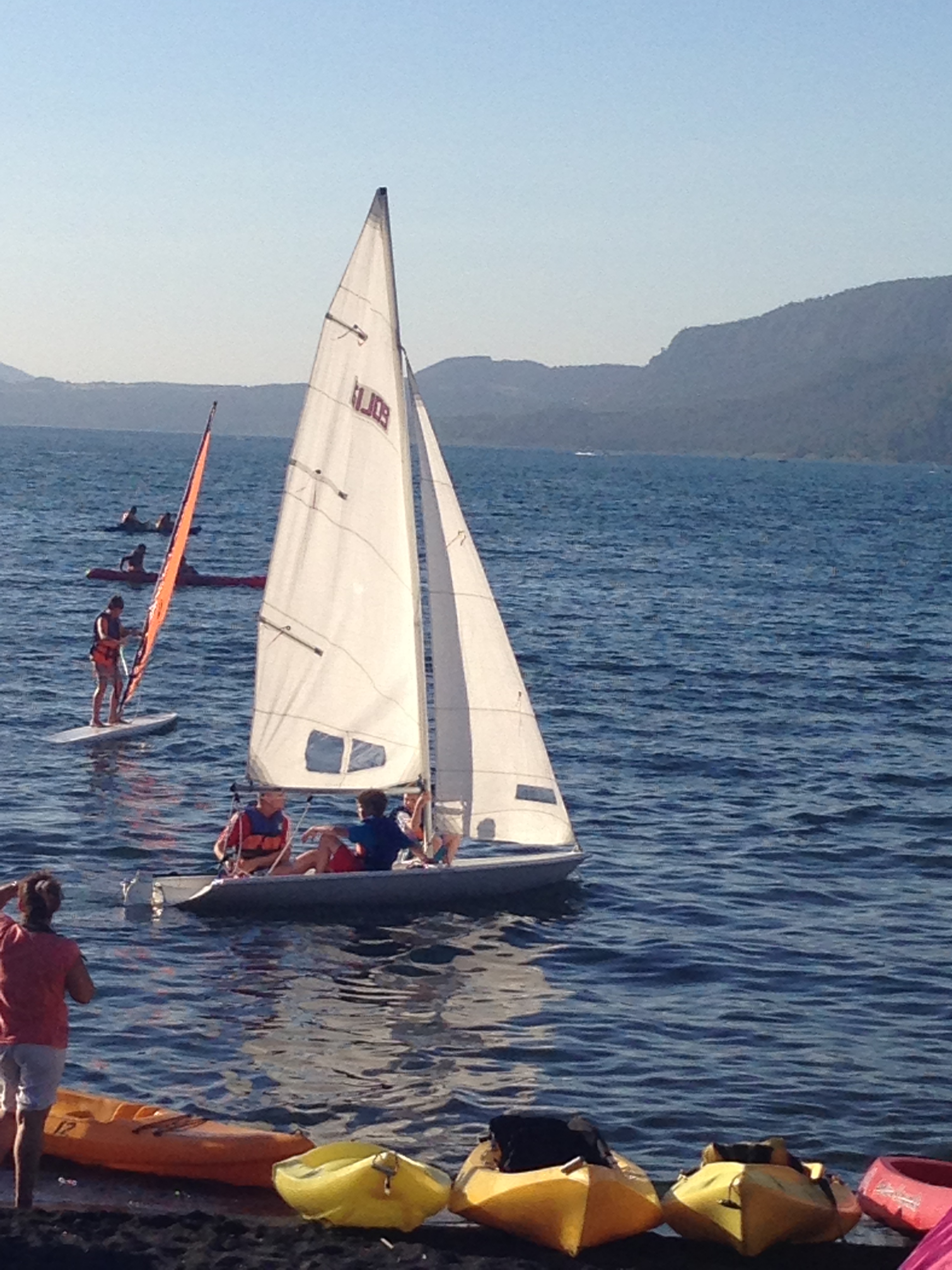 It’s been hotter than earlier in the week so going to the beach was definitely in order.  The other day we went to black beach – at first we were walking along and not seeing anyone – then we turned the corner and yikes – lots of people.  We carefully carved out our 8′ x 8′ spot with our towels, the umbrella guy came over and put up an umbrella for us and we were in business.  The sand is black – basically small ground rock – very rough, not fine like sand at the beach.  We all swam and hung out and had some fun.  The boys have been bugging me to go sailing – but every time we go it’s blowing 25 kots of wind and not a good place to let them sail.  But the other day the wind died down and we went out – it turned out to be a great 10+ knot wind – easily making way and not heeling over too far.  We spent a magical hour sailing and got done around 8:30 when the sun was starting to orange against the volcano – very cool indeed.   Chilean’s have now found speed boats, jet-ski’s and other power toys so the lake has lots of things zipping about, as well as wind surfers, parachutes, para-gliders and more.  Since it’s high season – everything is going – and every means to make a buck in the sun is being offered.  We aren’t really “Miami Vice/Beach Goers” so we were glad when we found a different beach today.