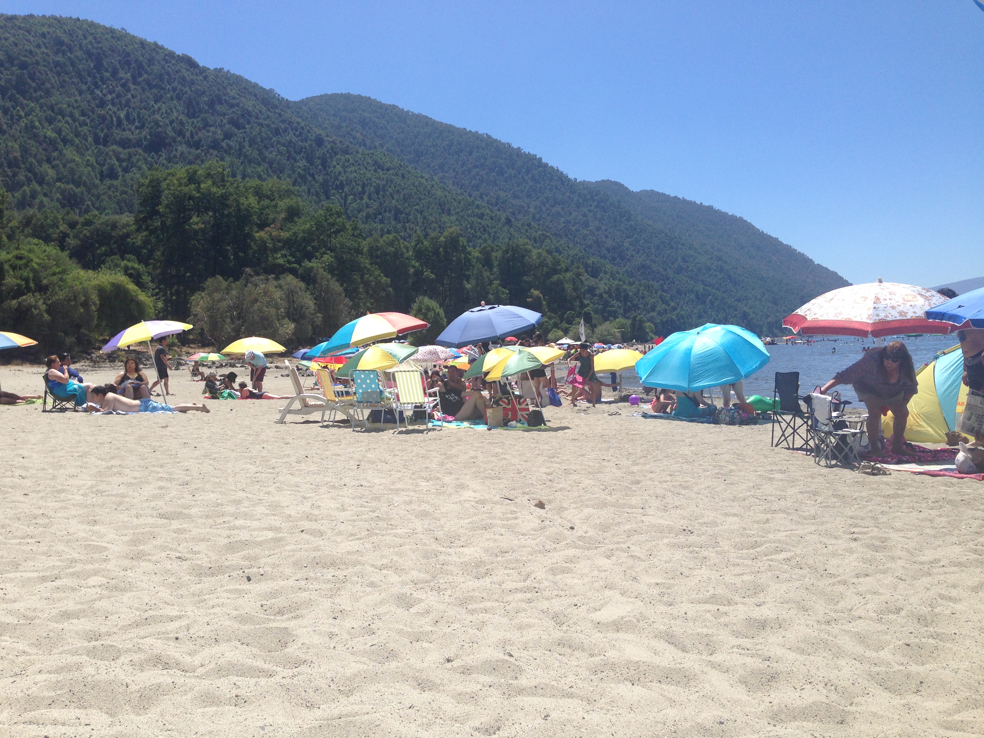 Today we went to “White Beach” – which is at a lake and about a 25 minute drive from our house.  It is at a much smaller town – similar to what Pucon was many years ago, but the beach is also smaller with less people as well.  We launched into action – quickly swimming out into the water – enjoying the lower quantity of people.  What I love about the culture here is that on the beach if there’s a spot in front of you it’s ok to walk in take that spot and make it your own.  We watched in a slight comedy as a family came in front of a couple in front of us – who were making sand castles and watching their kids in the water.  Then the “jones family” moves in.  The proceeded to put up 5 umbrellas, chairs, tie down umbrellas with side walls, etc.  The lady putting up all the umbrellas actually moved a guys towel so she could put her tent stake and connect her string to her umbrella – unbelievable.  The dude was actually sitting right there watching her do it.  It was funny, but when done you couldn’t see through their entourage of shade.  They only stayed about 2 hours which was nice.   We let the boys rent a tricycle water thing for 1/2 hour and they had fun paddling around.