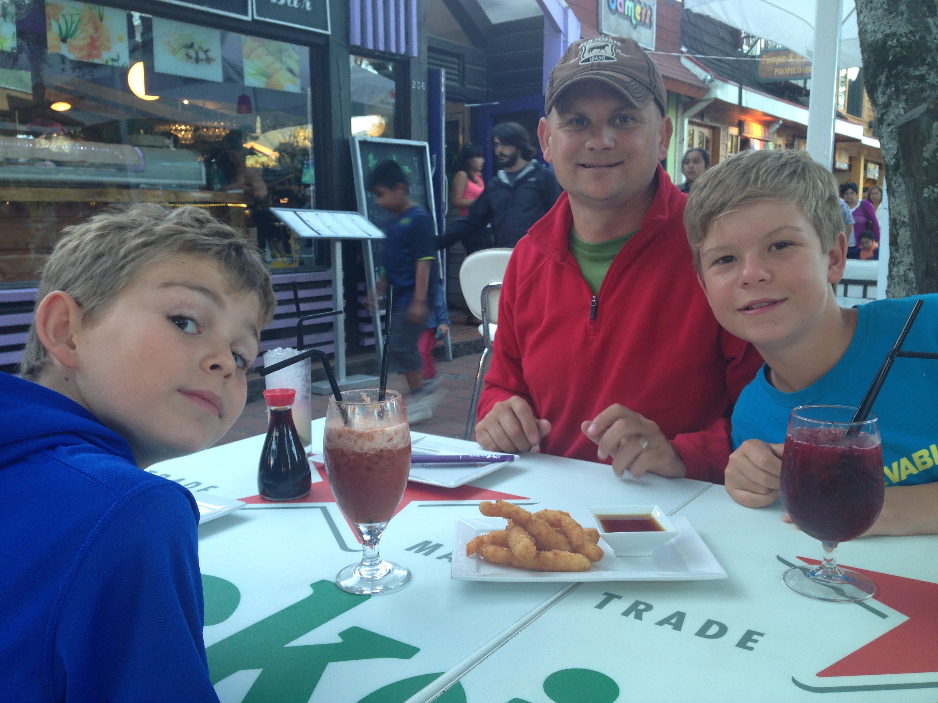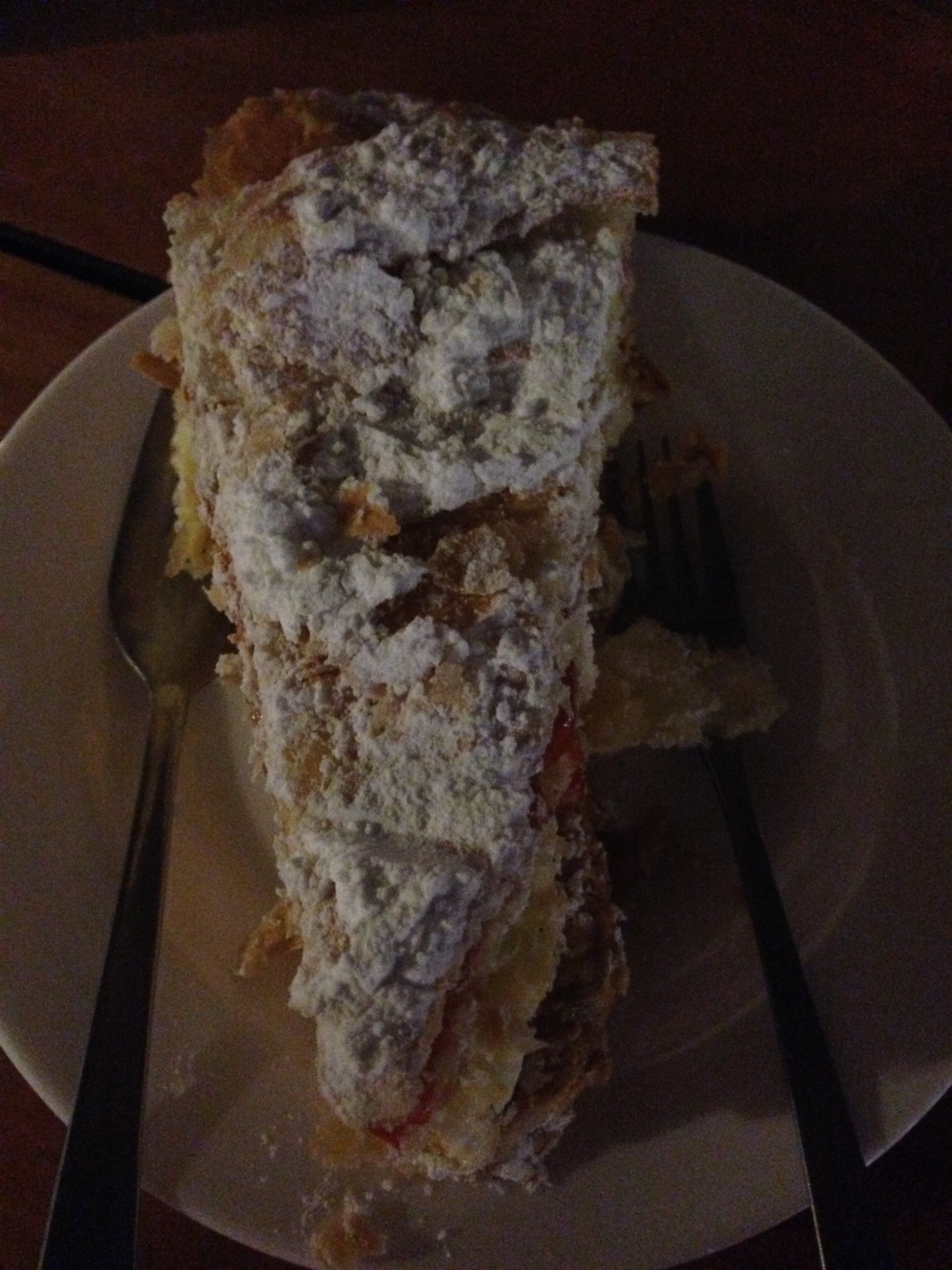 Dessert – last night we went to a Sushi place. It was pretty good – boys wanted sushi – so we stopped in and had some. Lots of things are made with shrimp and avocado. There were really only about 5 fish choices – they don’t seem to get the more popular things that we have in the states here. Most of the items we ordered were based on Tuna and it wasn’t red like you see in the states – more a gray color. It was ok – it was good and we moved on. The service here has really dropped in my opinion – many times your food will come, but if you want a refill on a drink or something else you always have to ask. No one seems to come back and ask if you need anything else. This I don’t remember from before when we were here. Anyway… last night we were sitting next to this other place that we had walked by that is a dessert oriented coffee shop type of place. After waiting for our bill for nearly 25 minutes at the sushi place (Gavin and I were playing tic-tac-toe on the table with chop sticks (clue anyone?)) – we immediately walked into the dessert place. So we’ve had some forays into desserts here – some didn’t go that well. I think Cindy was here on a mission – she went in, looked around, came back – pulled out her i-phone and was typing in the words from the menu – all to get the best choice possible. It really is too bad when you want dessert and you choose poorly – and you really like having dessert. So Cindy ordered this great piece of pie/cake/torta – the boys each had ice cream and I shared everyone’s stuff. I think it was a “win”.
