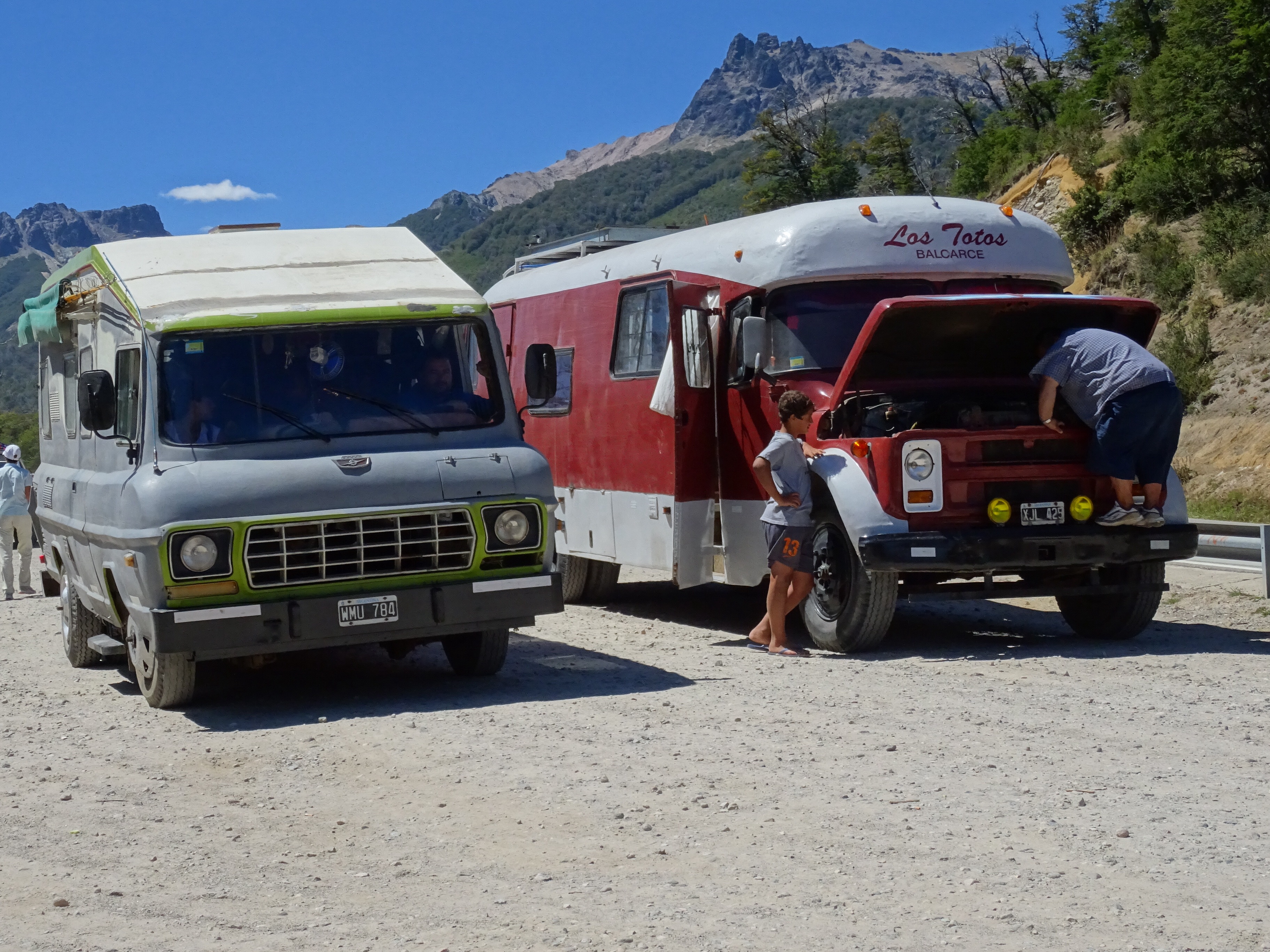 So, off to Argentina we go. Our first long term location, is Bariloche, Argentina. We were looking at maps, and we realized that the one day drive, would be something like, 10 hours. Not with the border crossing, of course. Our plan was to get across the border, and find a town to stay the night in. We found…..San Martin De Los Andes, Argentina. Perfect. We had found our way to Argentina. We set off a little while later. After an hour or so of smooth pavement, we hit some road work. I would say it spanned 5 miles. Paving the road, blasting rock, and drilling and digging made quite a show. Some signs made us think, ” oh no” . They were over exaggerating it quite a bit.