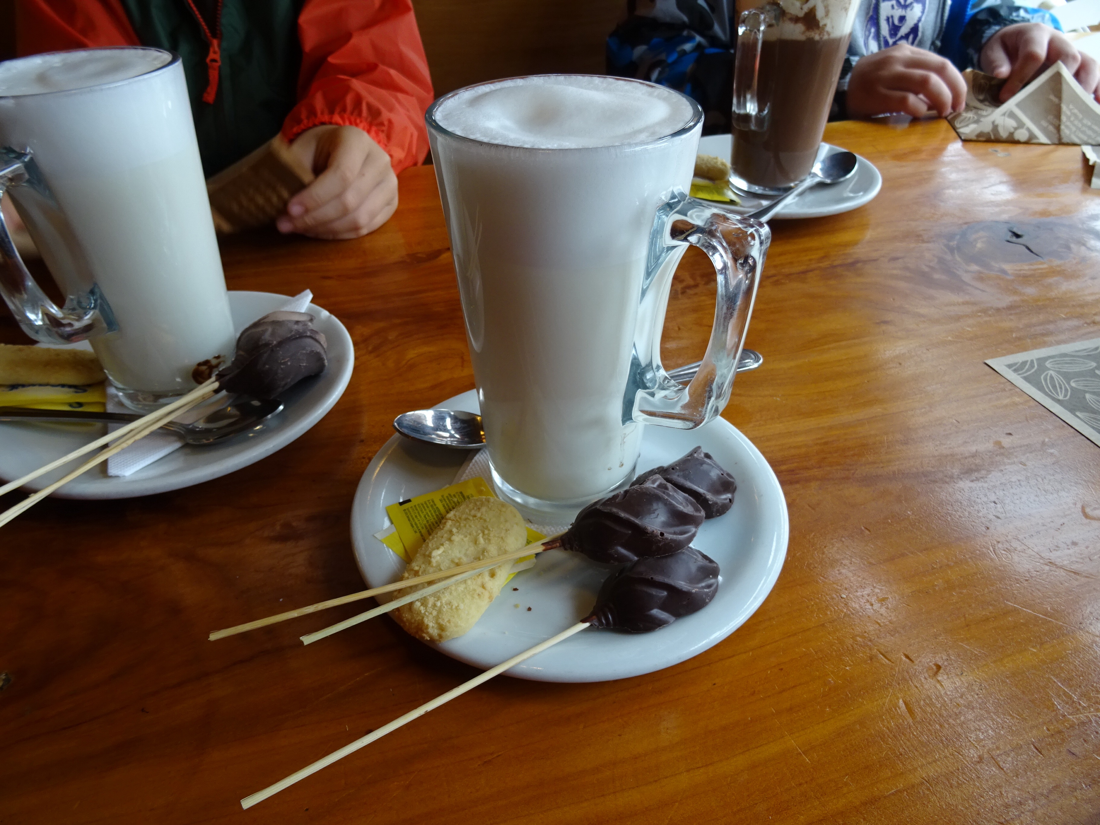 Submarine – ok we read about it, heard about it, and finally we found it.  There’s a drink down here in chocolate world of patagonia that is called the ‘submarine’.  It’s pretty simple – they bring you a hot cup of foamed mile, with several pieces of chocolate on the side – you then get to submerge the chocolate yourself and stir it – thus making your own hot chocolate.  It’s an extra step, but it’s very good and enjoyed by all in our family.