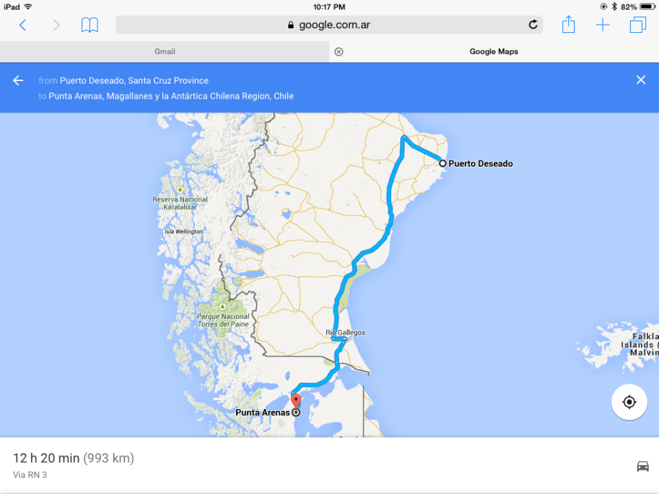 Turning North – we have left Punta Arenas and ave driven north on Interstate – 3 in Argentina. If you thought driving Kansas, or Texas was flat and boring, well let me tell you this has them both beat. We have driven for 2 days in heavy wind, dry scenery, big flat sections, with literally nothing around. The wind was blowing about 50mph, gusting to probably 80 yesterday. We got stuck at a stop for an hour where they had stopped traffic from going on due to the high winds. Every time a truck would pass you could feel the entire car shake from the airflow around the two vehicles. We met a guy on the boat who was riding his motorcycle up the same way – i hope he found a different route due to the winds. We ended up doing about 55mph given the wind conditions. The other thing – you go long stretches with nothing – no fuel stop, no rest stops, etc. So the advice you read about fill up when you can is very, very true. We have extra gas on board and today would have needed it if I hadn’t had stopped for gas to fill up, even though we had 3/4 of a tank. We are now in Puerto Deseado on the coast for two days until we move up to Bahia Bustimante for 4 days.