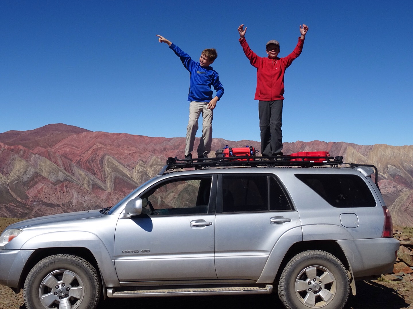 After hiking, we decided to drive don the road a little more and check out an old staging post. The post was originaly a house and due to where it was, the viceroy of Rio De La Plata made it a staging post, and the owner, the first owner of the post. During the war of Argentina’s independence, it was a barracks and housing for Generals that were traveling to help in Chile and Bolivia. The next day, we decided to drive north to go see some more rock formations. 1/4 of the way up the road, my dad says,” do you guys smell gas?” We checked our alltitude with our Ipad, and found that we had gone 2,000 feet too far up without presurizing the tanks on the roof. And guess what? The tanks were leaking gasoline. Even though we had 2/3 of a tank, we decided to put that gas in the car, so we wouldn’t have to worry about them. At that time, we were at 12000 ft, and we still had alot of switchbacks to go. At the top, we realized that we were at 14,300 feet. We looked at the map later at night and thought that the pass to chile was around 14,700 feet. You will find out how high it really was in the next post… Anyways, this is called the valley of 14 colors, spectacular.