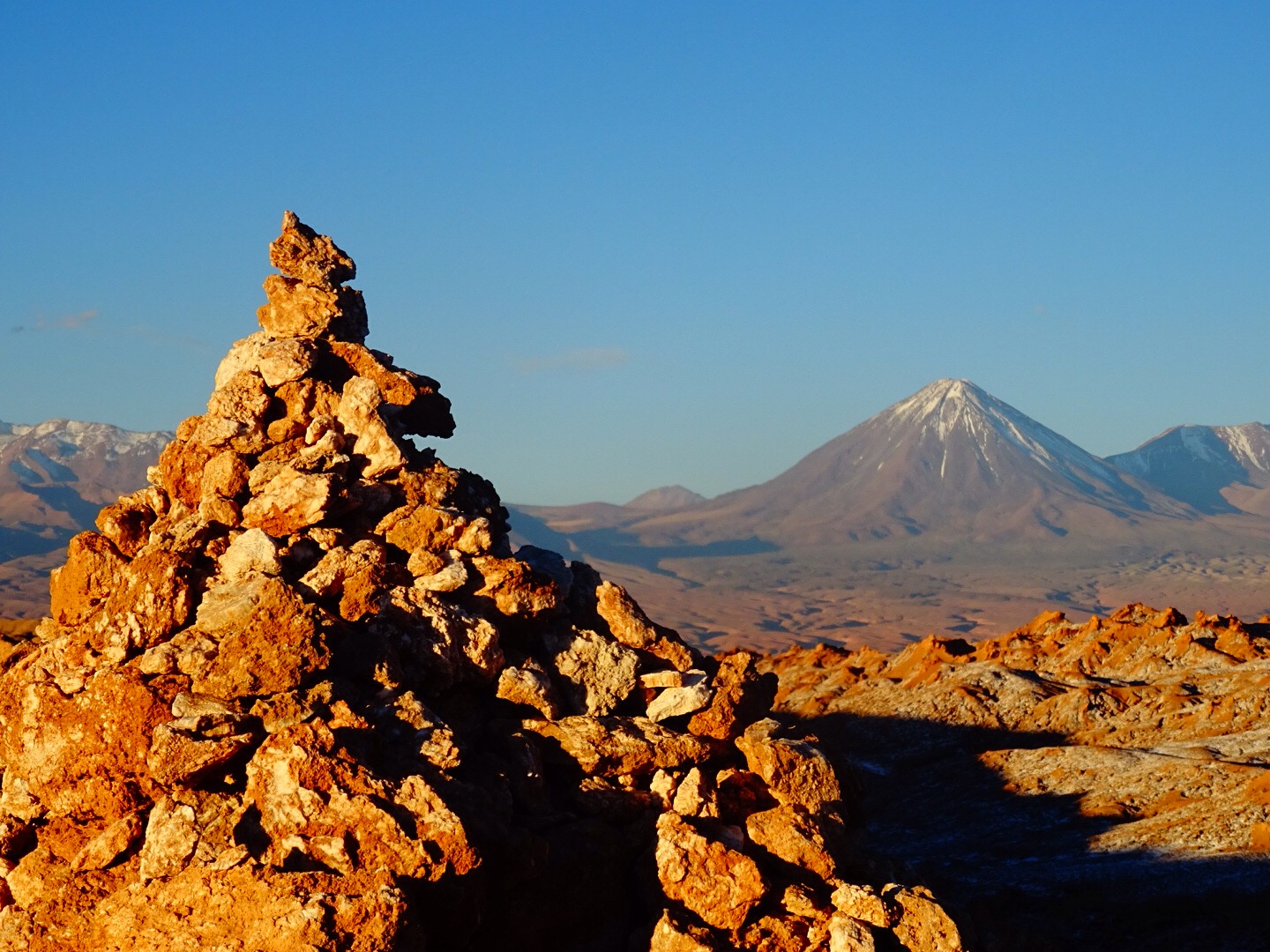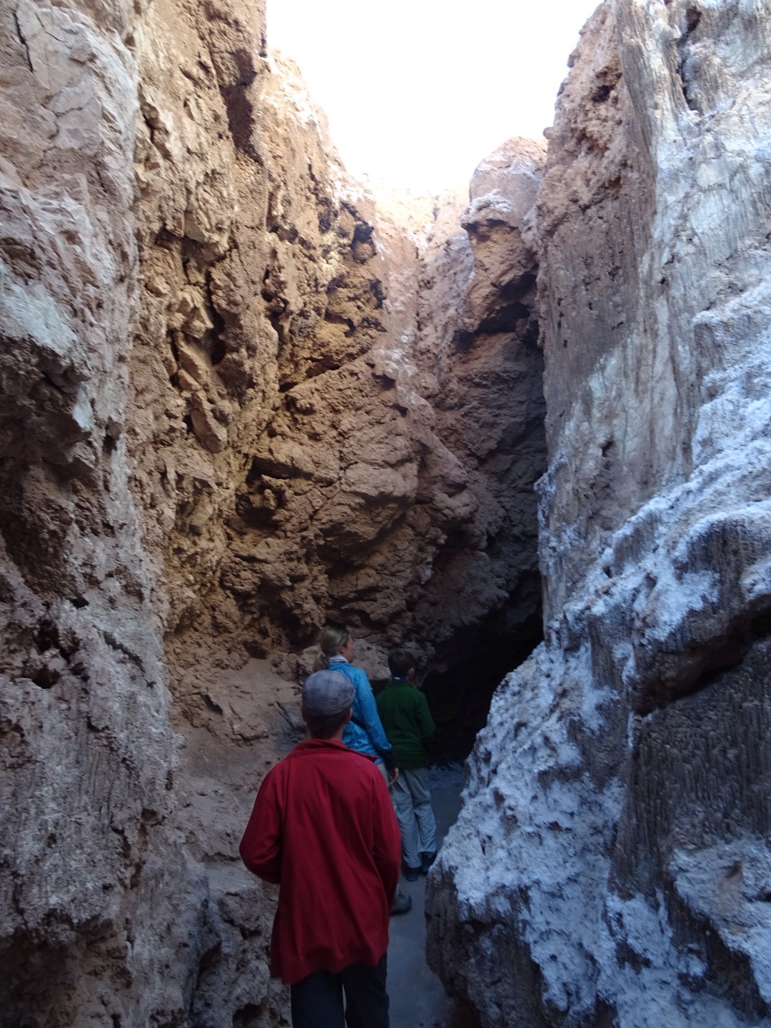 Yesterday we took it easy in the a.m., but spent the afternoon walking the valley de la luna (valley of the moon).  We were able to drive in most of the way, then did this great hike at sunset to the top of a valley where we could see all around and experience some great sights in the desert.   This area is bordered by a line of volcanoes so it makes some spectacular sights.  All of the ground is compacted with salt so everything is very hard.  We were able to walk through a very long cave which we used Cindy’s cell phone for it’s flashlight to get through – very fun, but I don’t like small spaces ad  the light went out at a very small place that was about 3 feet high and you’re climbing through on hands and knees.  Gavin quickly turned it back on and we progressed out of the tunnel.