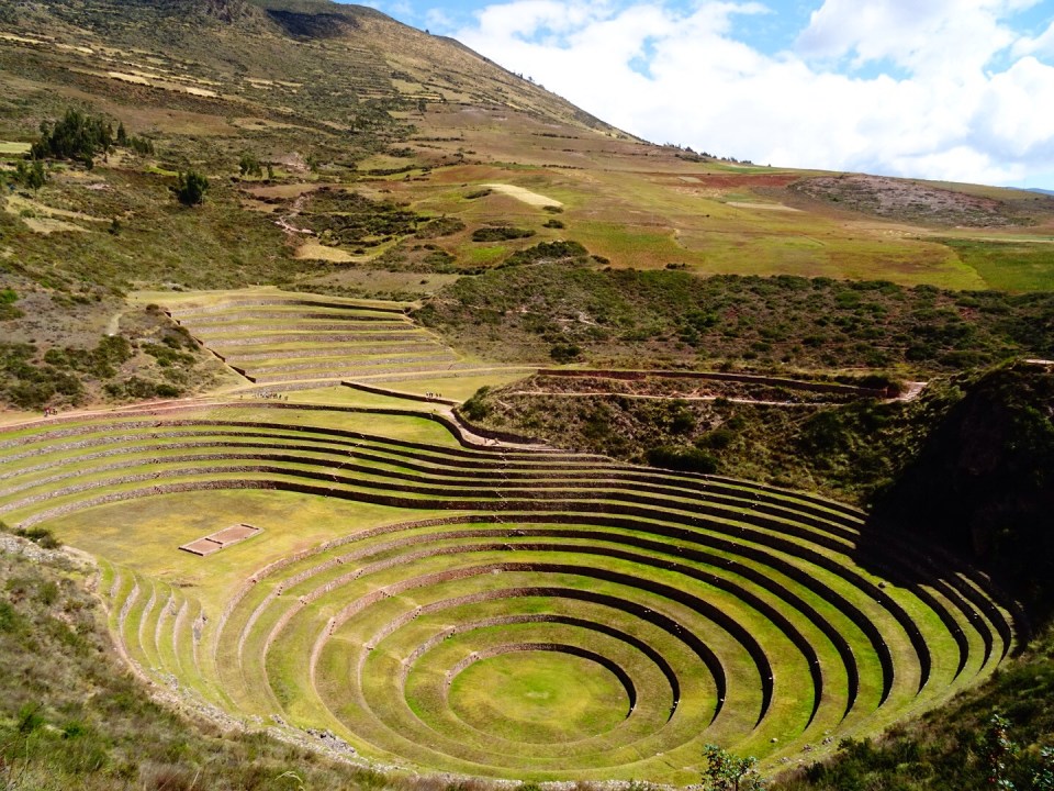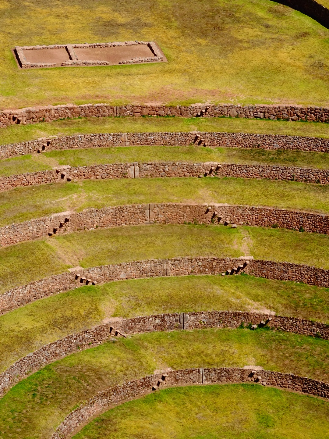 Moray was the Inca research labratory for foods to be grown in the region. The built these enormous circles that step down into the middle. If you notice the steps that you can climb up/down into the circles they are pretty smart – they are staggered so you walk in a straight line on each level – so stairs on the terrace. This place is high on the edge of the valley and surrounded by brilliant fields of wheat and Quinoa. It’s a pretty neat place to go see and visit. It’s remarkable how the Inca society was able to have all these things in the year 1400-1500’s. In this way they could feed the people, know what to grow on what levls and when to grow it. The interesting thing about the terraces is that the rocks heat up during the day, acting as a heater during the night when it is very cold in the valley – very smart. Each terrace that you see is built using four layers – at the bottom rocks, then gravel, then sand then finally soil on top. Sort of how you would make a planting box system today.