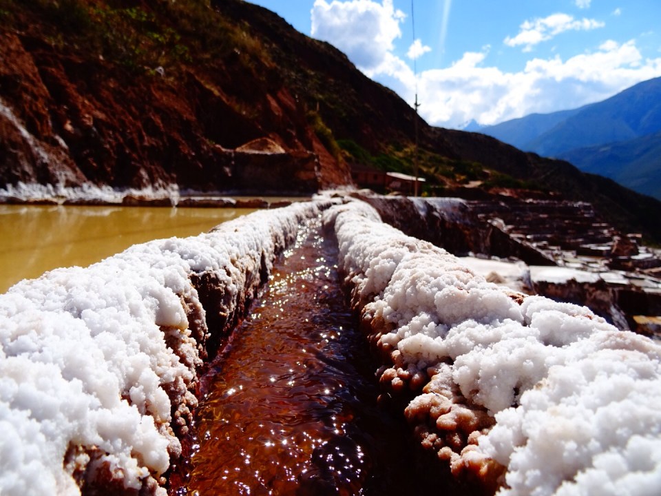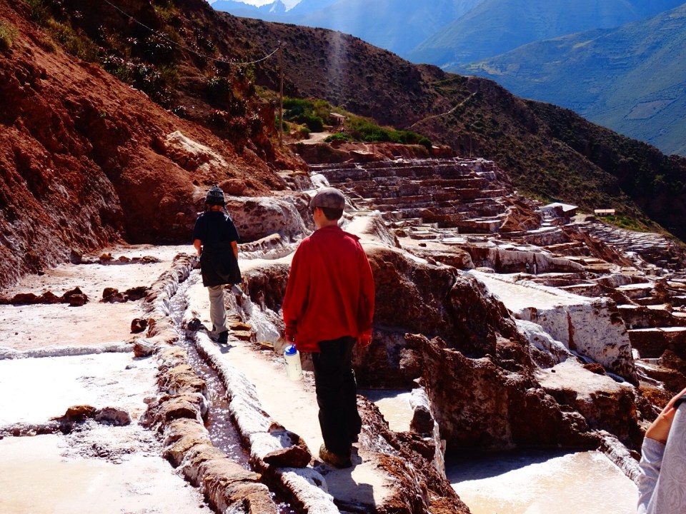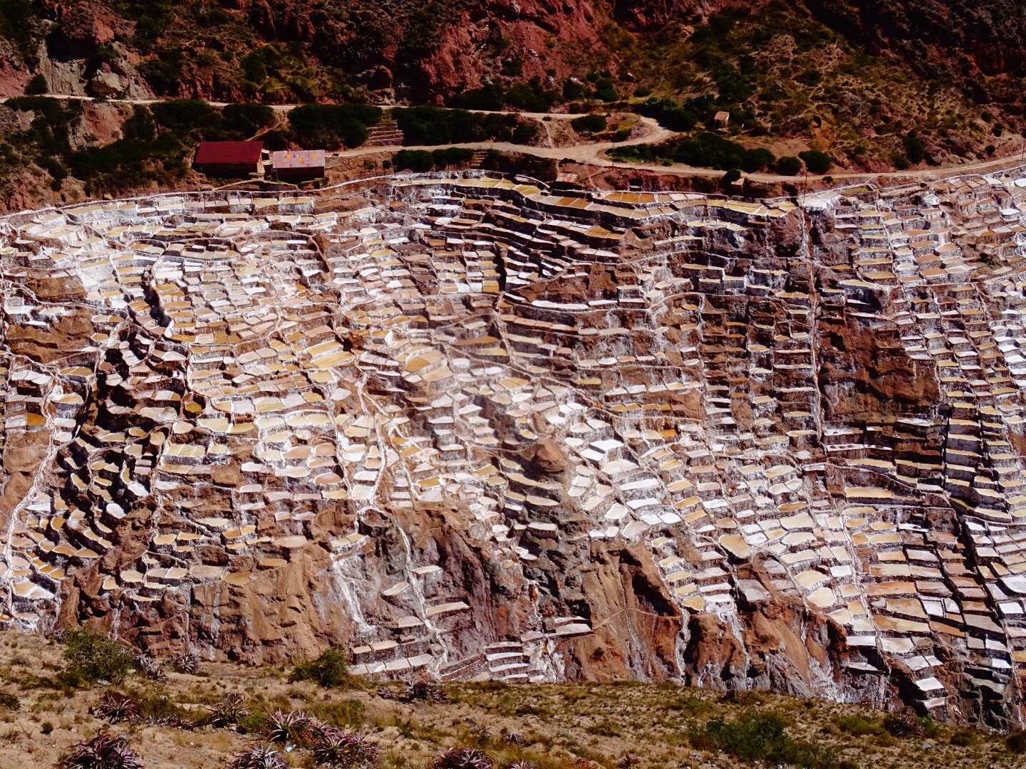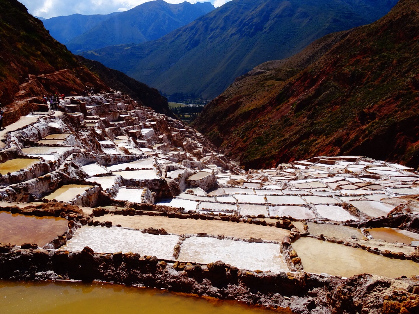 This has to be one of the coolest things we have seen on our trip. A long time ago someone discovered that a small stream in this valley produced salt rich (60% salt) water. They built this huge area of terrace/pools and little water streams to fill the terraces with salt water. They then let the water evaporate and then you get left with salt. You may see “peruvian pink salt” in stores – this is where this comes from. We walked around for about an hour – the salt vapor is a bit intense and we smelled like salt later. This place is an unbelievable engineering feat.