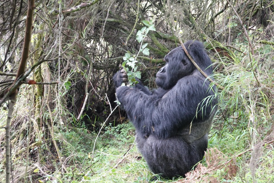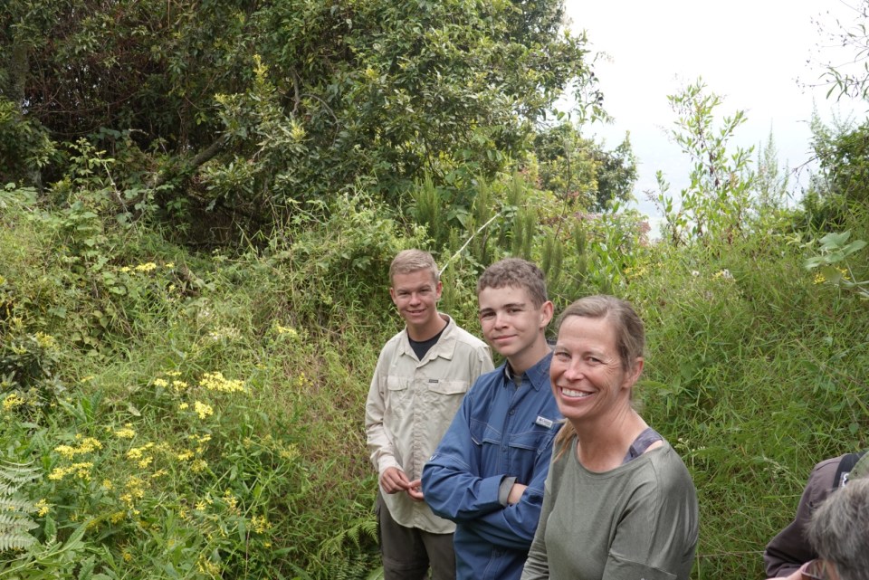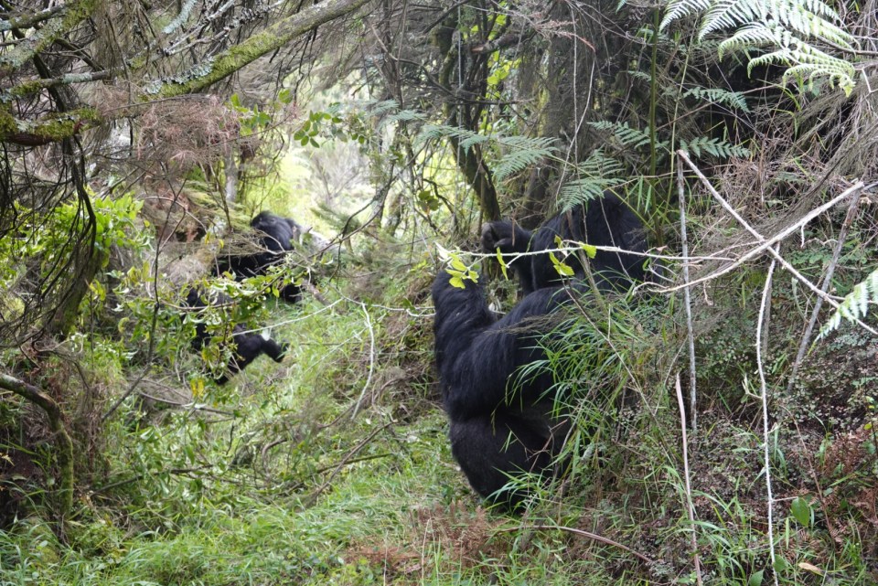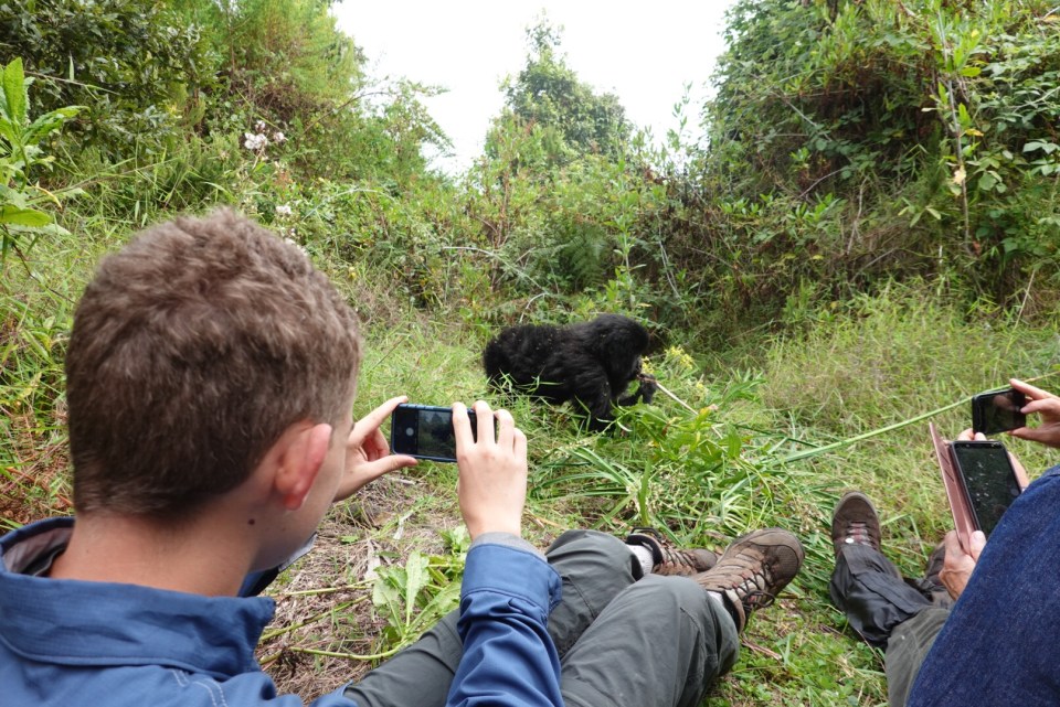 We then moved further down the hill to find a baby Gorilla and his/her mother eating. The baby gorilla came forward to within about 1 foot of Gavin, the guides coaching him out with grunts and noises. We then continued to trek, finding a mom and her baby eating leaves. In a ‘scary move’ the mom decided to move – right towards us – specifically Hayden – and within about 2 feet of him – much different than a baby – this was a real life size gorilla moving right towards you… Happily she moved by with her baby and pushed right by all of us.