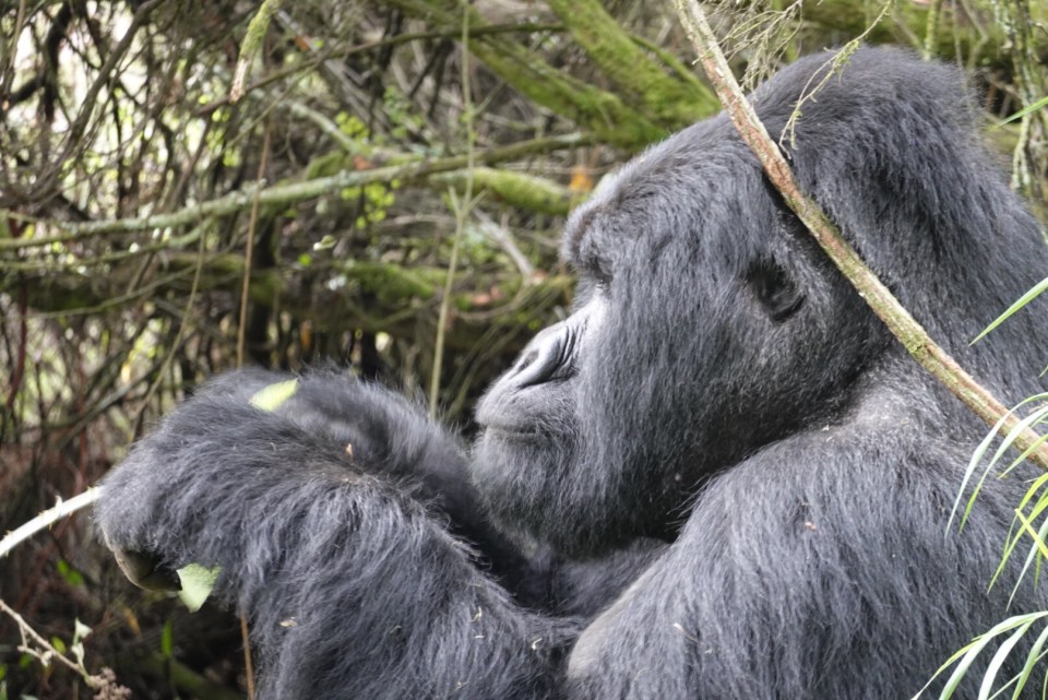 We were hiking as a group, then all of a sudden stopped, packs off and walked about another 20 feet around a corner. And there you have it, a huge silverback sitting there eating leaves. I could not believe how close we were to him – less than 10 feet. The guides slowly walked around, cleared some brush and we all sat down. Spent about 15 minutes sitting next to the big silverback then he moved away.