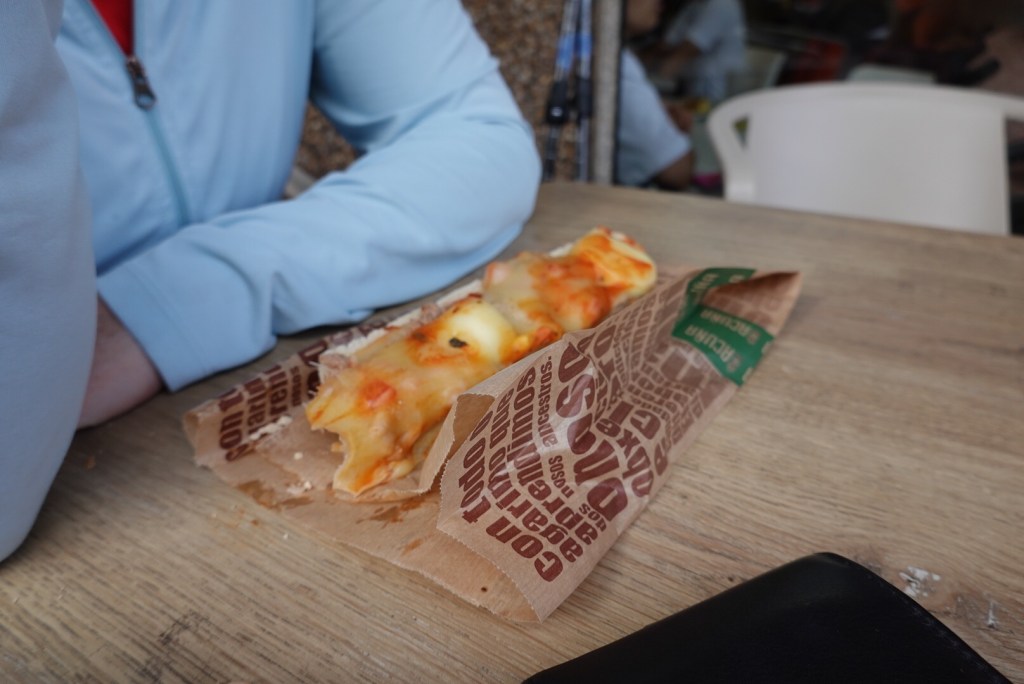 The funniest thing that happened today was Cindy was faked out into eating a piece of a boiled egg. For those of you that know Cindy, boiled eggs are not her thing (at all!) – even the mere thought of one has her wincing. This time the culprit was a breakfast “pizza” bread that Cindy ordered at our first break for the day – thinking those chunks look like big pieces of (yes you got it) Cheese! This should be a great treat. Half way through Cindy realized she was conned into eating a piece, then promptly dug the other pieces out. To the passer by it was surgery being had at our table.