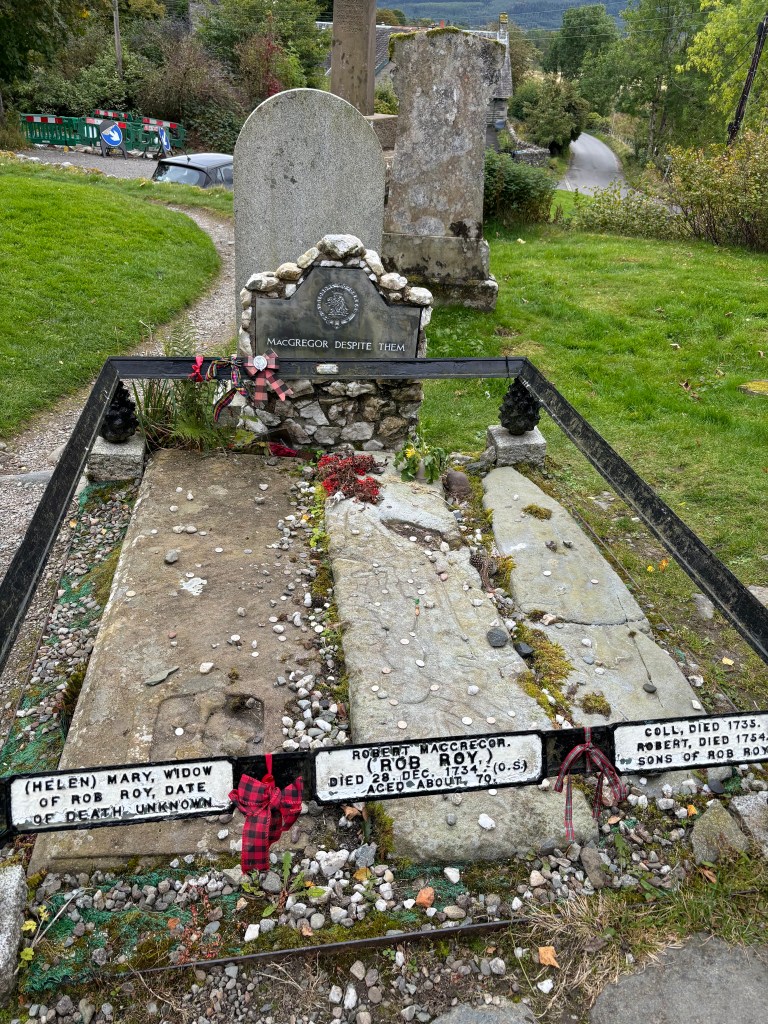 Well the hike today turned into a little more than we were thinking – we took a detour to see Rob Roy’s grave (see pics) – who was a notorious outlaw in this region, so fitting for us to go visit, especially wince we are hiking the “Rob Roy Trail”. Today started with a little misty/rain – and that was fine but then add a little wind and it was pretty cold. Of course you see a Scotsman standing beside the road in a T-shirt smoking a cigarette – meanwhile I’m contemplating if I should put my Melanzana over my already three layers of stuff I’m wearing… The high temp today was 49F, the low last night was 35F – so I’m assuming it was say 40F this a.m. before the wind-chill.