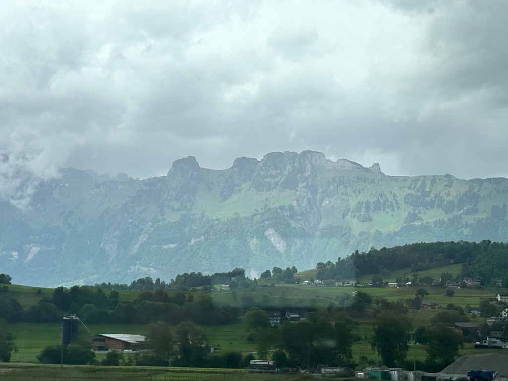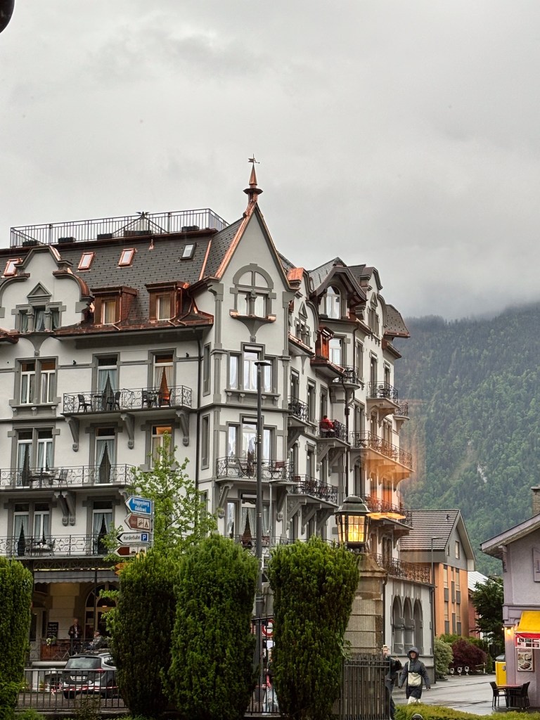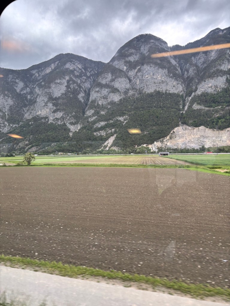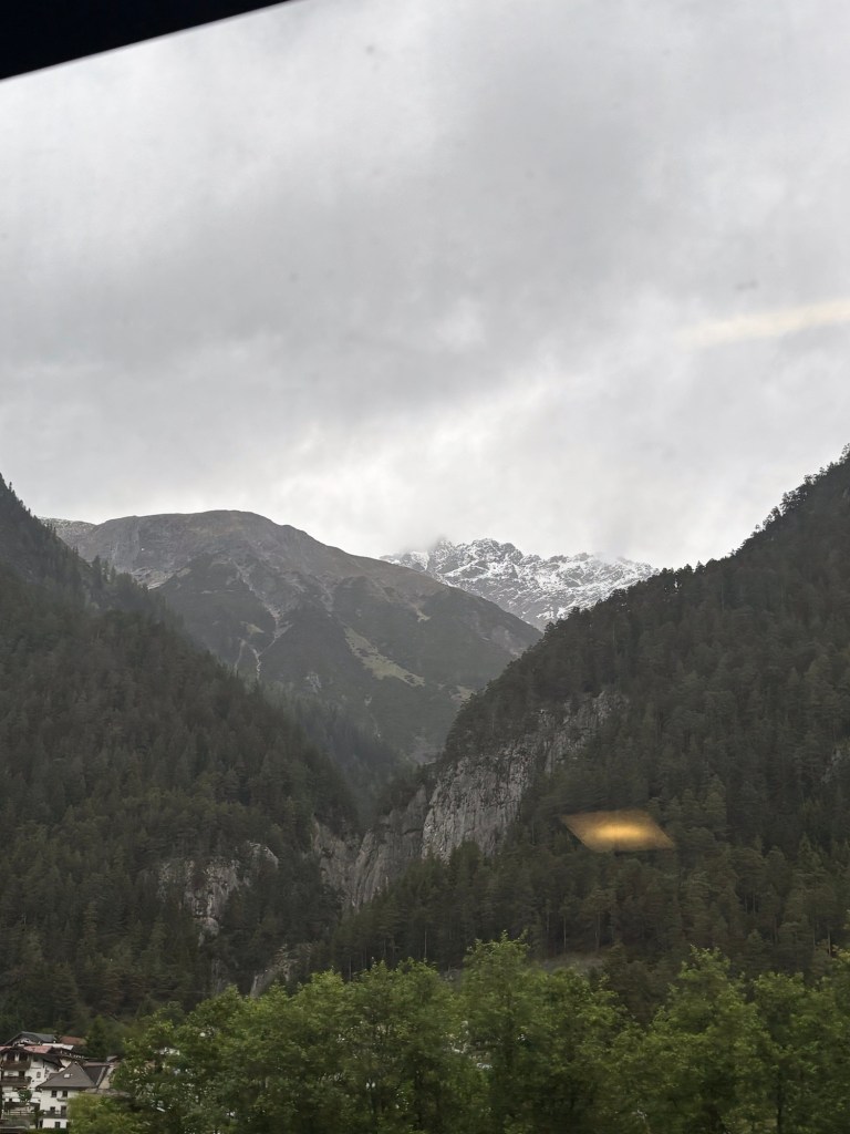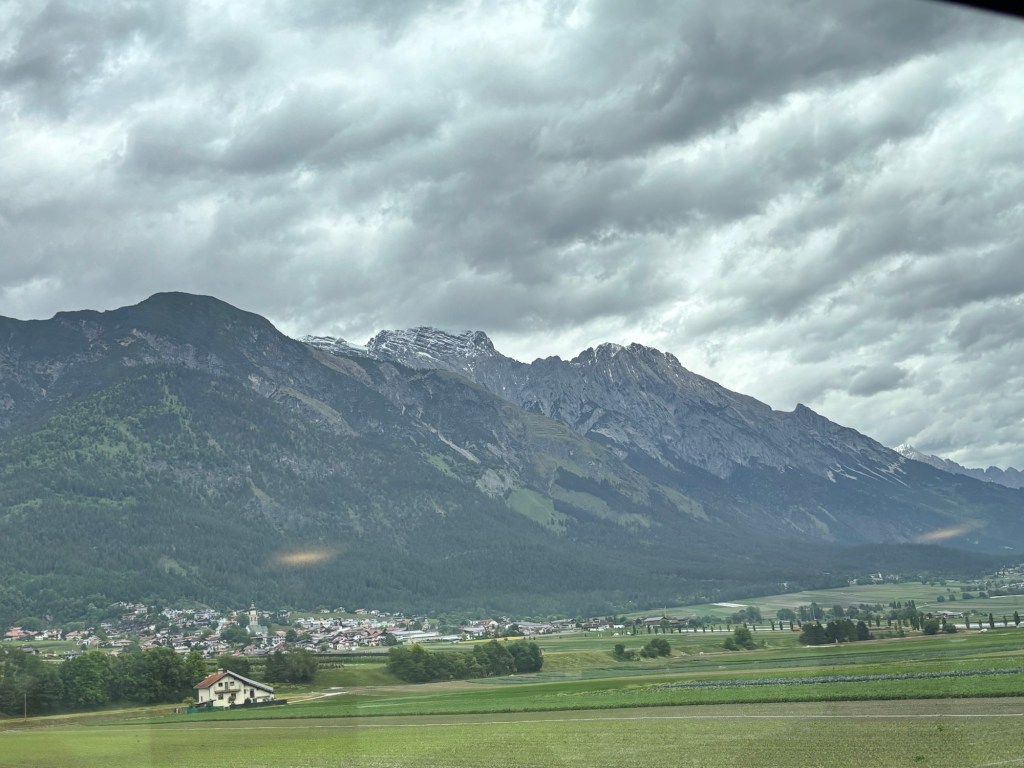 Ok a brief post today, mostly about pictures – we took the train from Salzburg to Interlaken Switzerland yesterday – about 7 hours of train riding to get here, but via Innsbrook Austria – so via the mountains. It was a pretty cloudy and raining passage, but in some places we could see the near tops of the peaks as we rushed by.