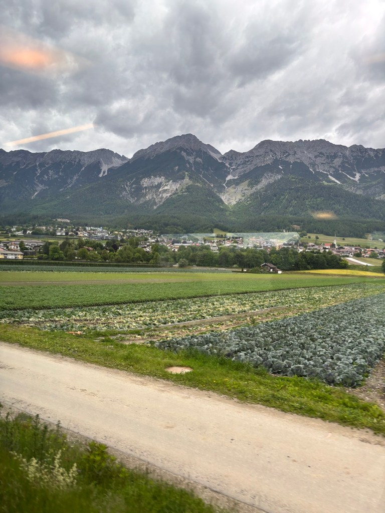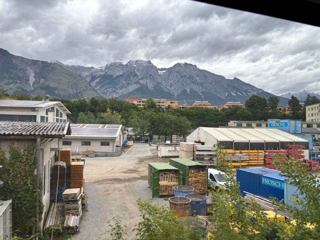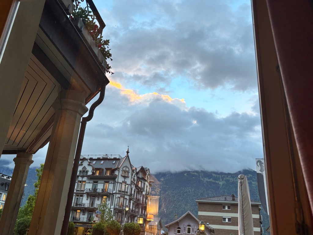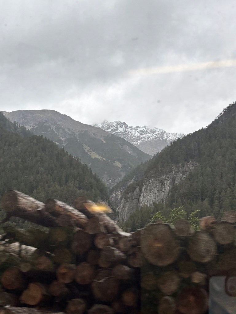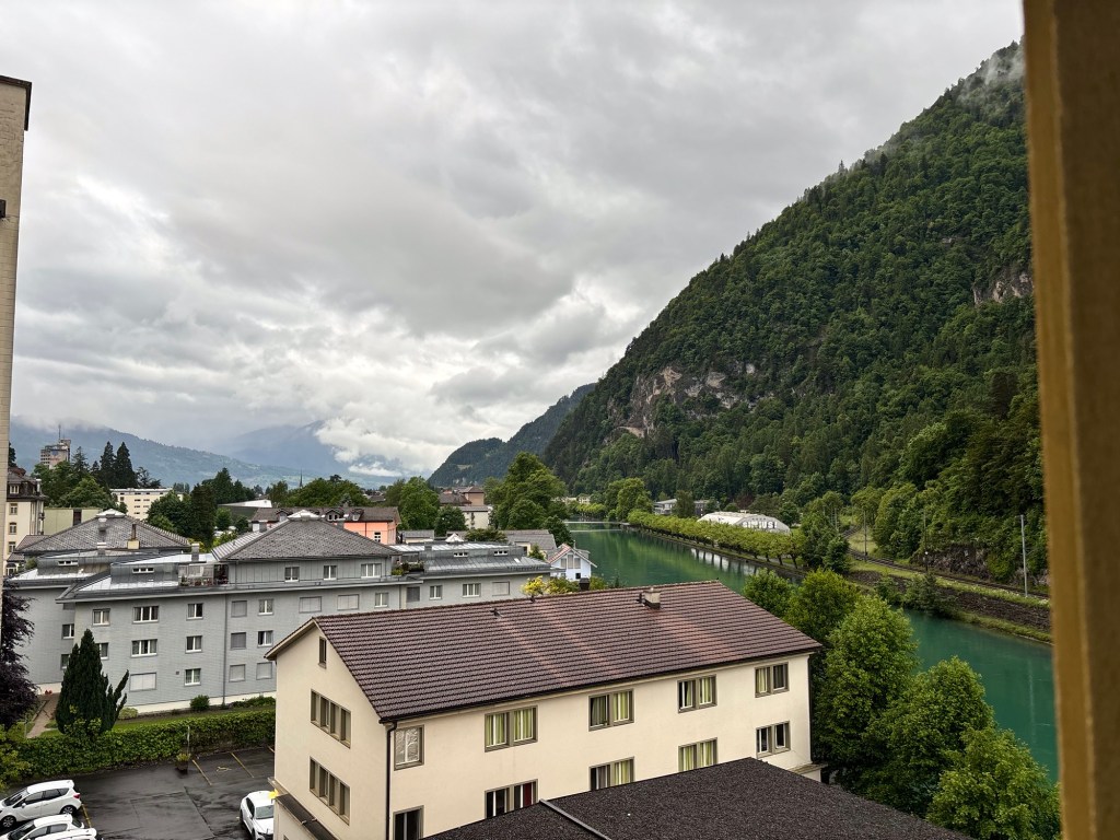 Ok a brief post today, mostly about pictures – we took the train from Salzburg to Interlaken Switzerland yesterday – about 7 hours of train riding to get here, but via Innsbrook Austria – so via the mountains. It was a pretty cloudy and raining passage, but in some places we could see the near tops of the peaks as we rushed by.