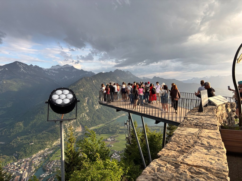 Once at the top we proceeded quickly to cut away from the herd and identified a spot for the evening feeding. We were quickly ordering while the rest ran out to the overhang to take pictures, etc. Briefly noticing the clouds and rain that was in the distance and heading our way. After ordering we then noticed all the staff moving things around, and then quickly putting up very large umbrellas over the tables (including ours). Note: when getting off the tram we noticed that there were already about 200-300 people in line to come back down off the mountain – other people “in the know” I guess…