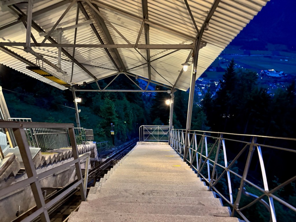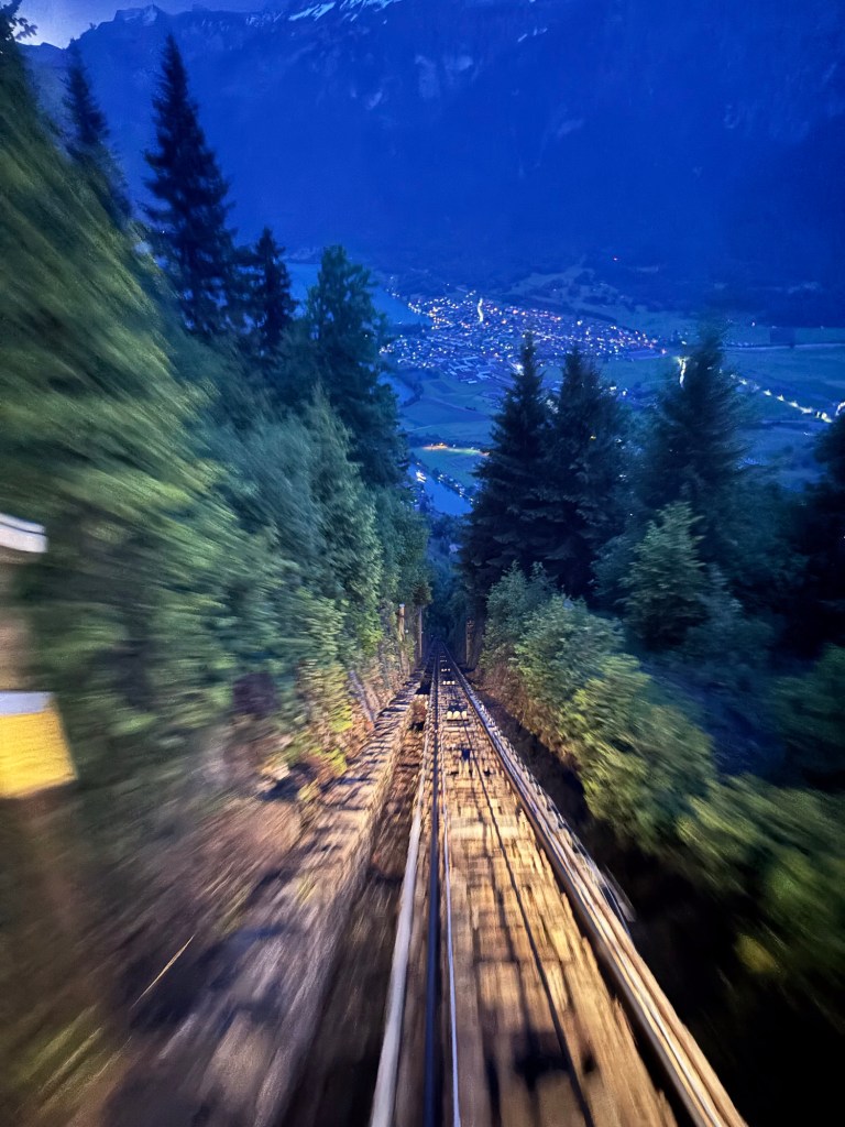 For our evening activities we had a recommendation to go to a quiet spot overlooking the city for dinner. Casually we strolled to the entrance of the tramway (cog tram) that takes you up to the top of the hill (3000 ft higher), about 10 minute ride. As we turned the corner you then see that other people had been told the same thing (!) this was not our secret spot as about 200 other folks were standing in line waiting to get on the tram. Oh well, tourist land we are in for sure… The wait didn’t take too long and we quickly proceeded for more human sardine packing into the tram (which Cindy absolutely loves) and whisked away to the top.