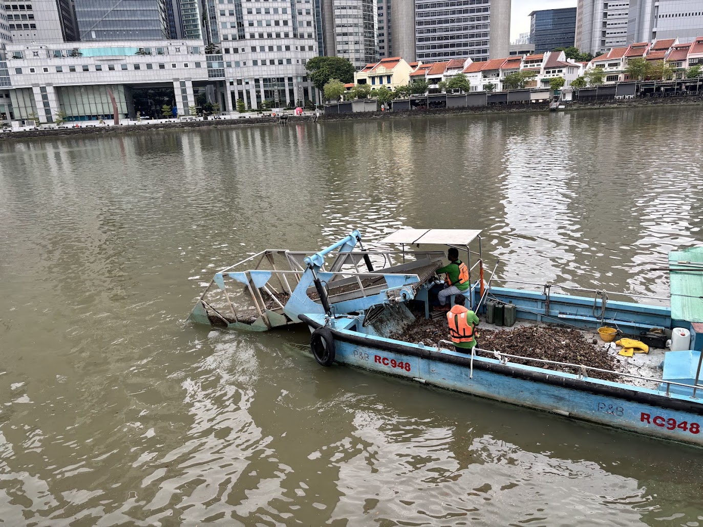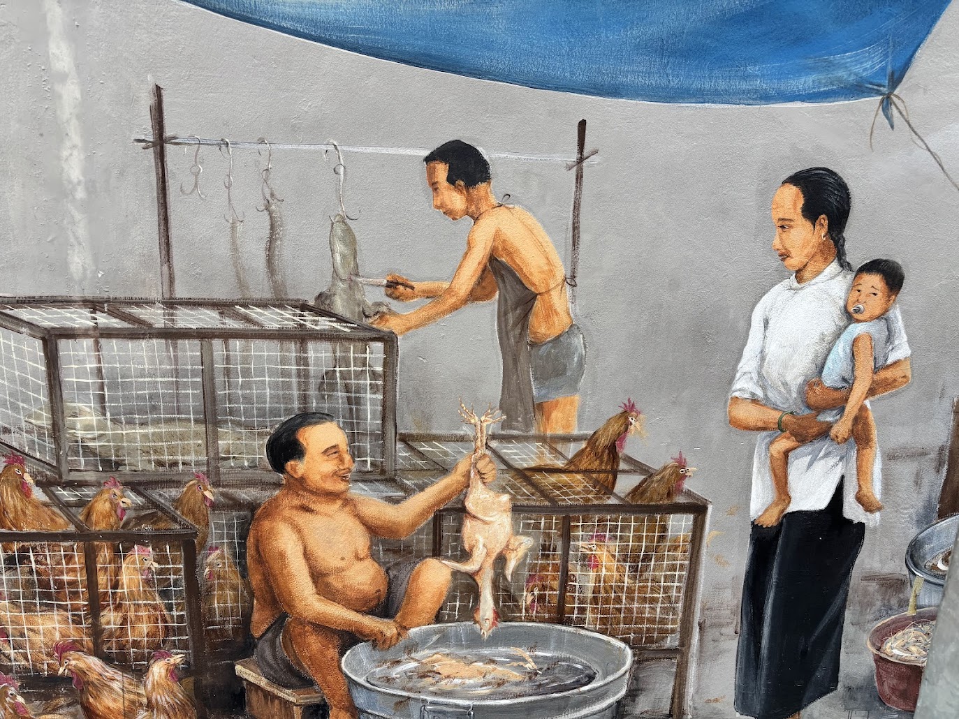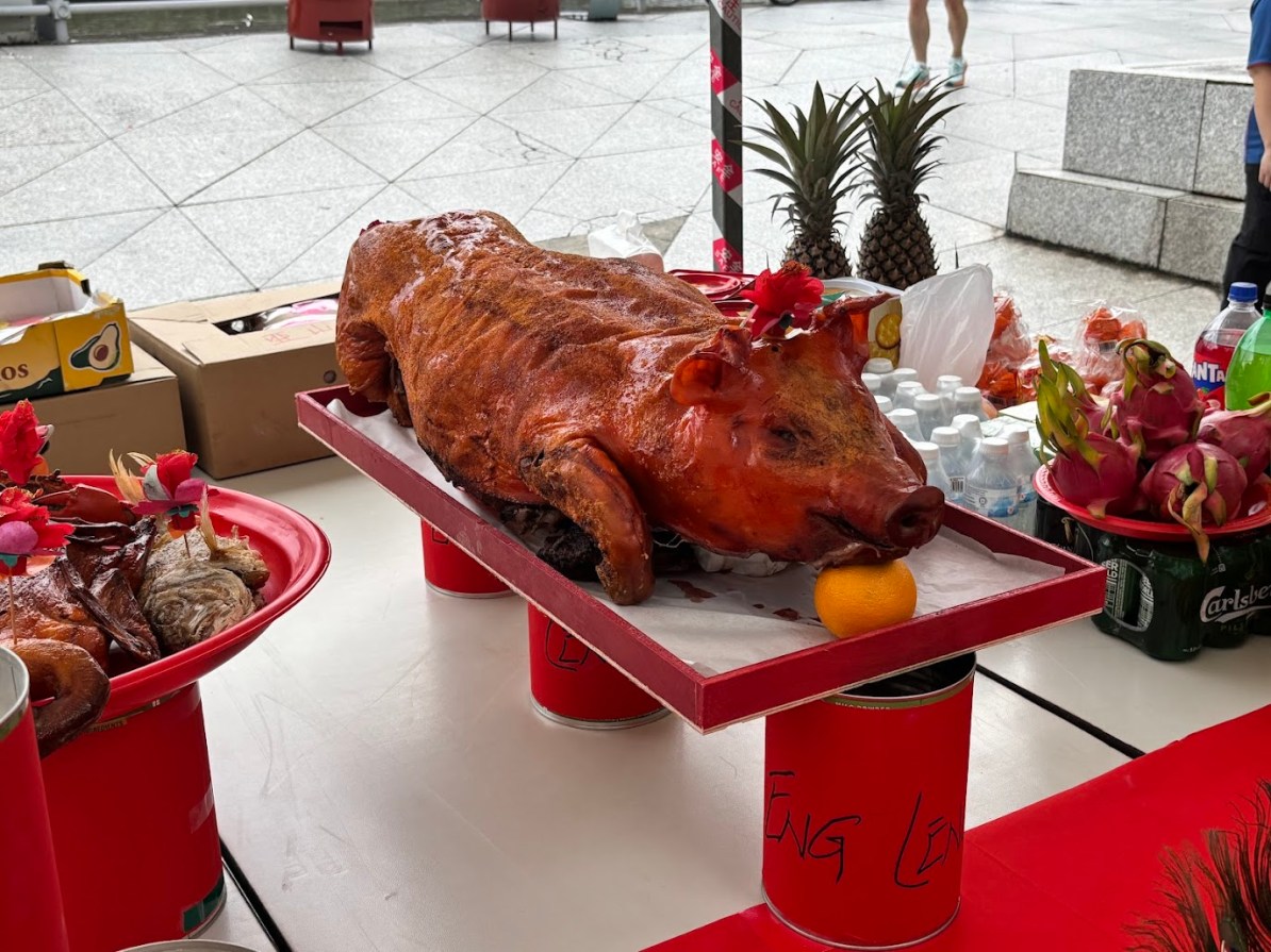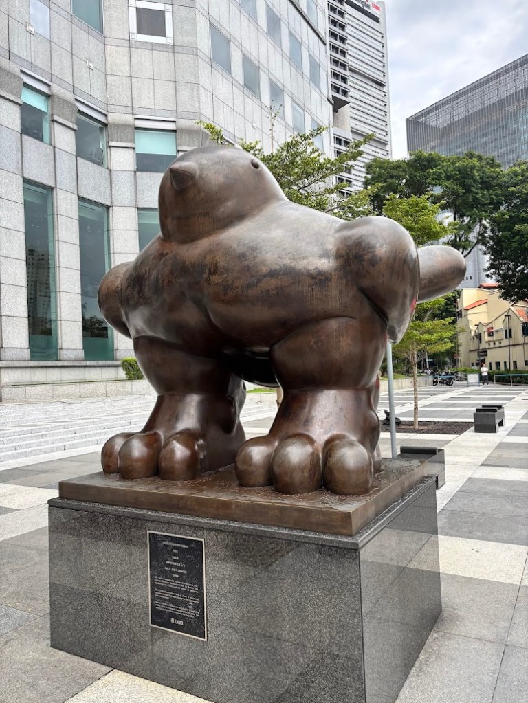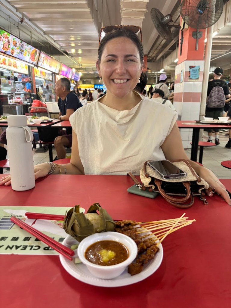 So this morning walked down from the hotel towards the city, found a pig (picture) and supporting friends… Generally it’s very clean here – Ashley said chewing gum is not allowed – glad that’s not a thing for me! But we were able to walk around China Town and see the various shops, etc. Ashley is also a travel agent, and as such has a list of places, things and to-do’s ready to go. We actually went and found two separate food booths – one is for “chicken and rice” – seems pretty basic enough – but there was about 100 people in line for it, so we passed. Looking at peoples plates it looked a bit bland, but I guess it’s very good. We instead found ourselves eating pork and chicken satay’s at a different booth – it was good and also cheap.